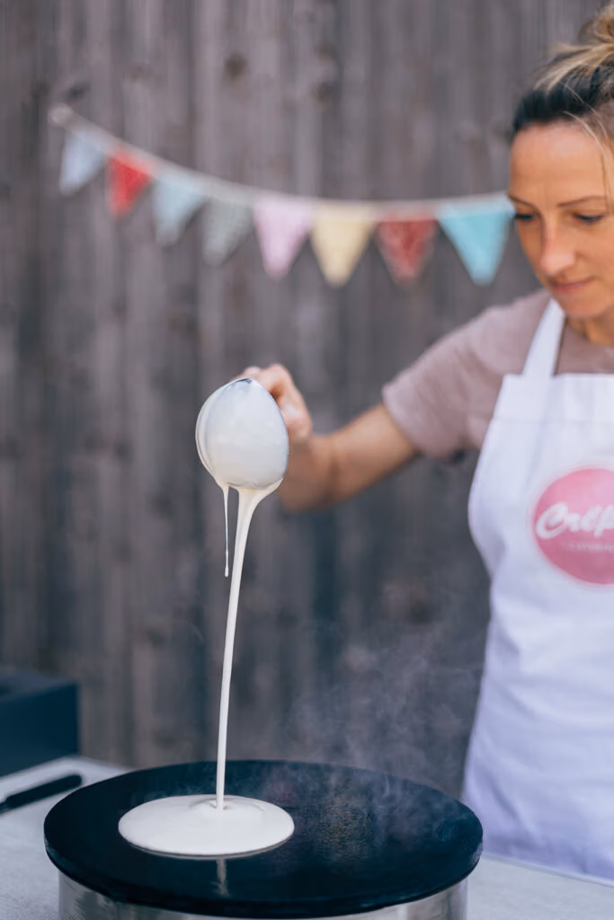 Wir bereiten unsere Crêpes stets frisch vor den Augen der Gäste zu. «Live-Cooking» sozusagen. Das heisst, dass wir dafür auch etwas Zeit benötigen. Bei kleinen Gruppen bis 25 Personen sind 2 Stunden möglich, danach wäre ein Minimum an 3 Stunden gut.